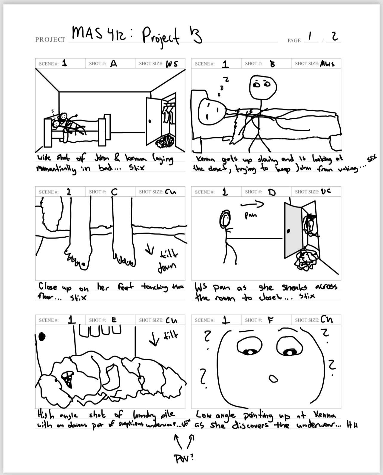 This untitled project is a short film that I storyboarded, shot, and edited for a video field production class at the University of Kentucky. I was tasked with creating a short film that tells a story in less than 60 seconds using only 10 shots without the use of sound. It follows a woman snooping around her sleeping boyfriend's room when she finds something incriminating in a pile of his dirty laundry.